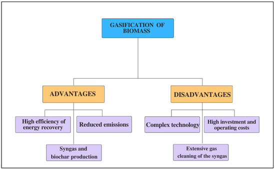 Sikarwar and Zhao (2017) also highlight how biomass gasification alters the carbon-to-hydrogen mass ratio, resulting in a higher hydrogen fraction and an increased calorific value in the produced gaseous product [80]. However, it is important to note that while biomass gasification holds the potential to generate a fuel gas suitable for power generation or synthesis gas applications, the volatile components in biomass often contain tar, which is a complex mixture of aromatics, as discussed by Tasaka et al. (2006) [81]. Figure 9 provides an overview of the advantages and disadvantages associated with biomass gasification.
