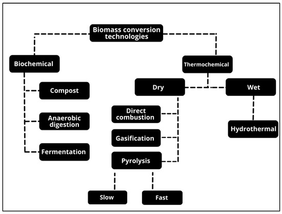 Biomass can be converted into several useful forms of energy and biochemicals using different processes and technologies [40,41]. Broadly, biomass conversion technologies fall into two categories: biochemical and thermochemical [42]. The selection of a specific conversion technology is influenced by several variables, including the type of feedstock and its moisture content, as well as the quality and quantity of biomass feedstock, its availability, the desired end products, economic considerations like profitability and market accessibility, and environmental considerations [43]. Rosendahl, L. (2010) explains that biomasses are also classified according to their water content when used for energy purposes [44]. Therefore, high-moisture biomass would not be appropriate for technologies that require prior drying, but instead would be appropriate for technologies that benefit from water content.