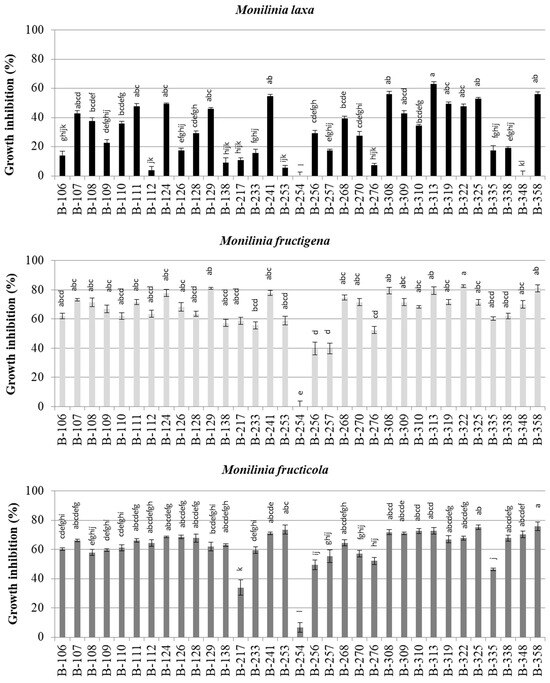 In vitro antagonistic activity of Bacillus spp. against Monilinia spp. using agar well diffusion method. Data in the figure represent the mean growth inhibition of two independent experiments with four replicates. Columns, representing average growth inhibition, with the same letters are not significantly different (Duncan’s test, p > 0.05). Only columns marked with the same colour are comparable for significant differences. Bars represent standard deviation.