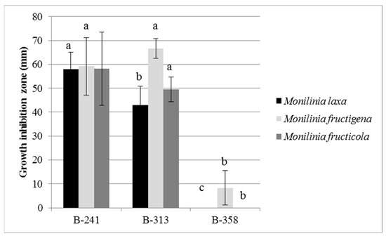 The results of the investigation of the effects of three Bacillus spp. strains on the growth of Monilinia spp. isolates in vitro using the agar well diffusion method are shown in Figure 2. The widest zone of inhibition was formed by the strain B. subtilis B-313 against M. fructigena (66.7 mm). Uniform inhibition zones (approximately 58 mm) against all three Monilinia spp. were found for B. amyloliquefaciens B-241. No statistically significant differences were observed in the antagonistic activity of two Bacillus spp. strains (B-241 and B-313) against M. fructigena and M. fructicola, while their activity against M. laxa differed significantly. The strain B. subtilis B-358 exhibited weak inhibition of all fungal isolates tested in this study; inhibition zones against M. laxa and M. fructicola isolates were completely absent, while the zone against M. fructigena isolate was below 10 mm wide.