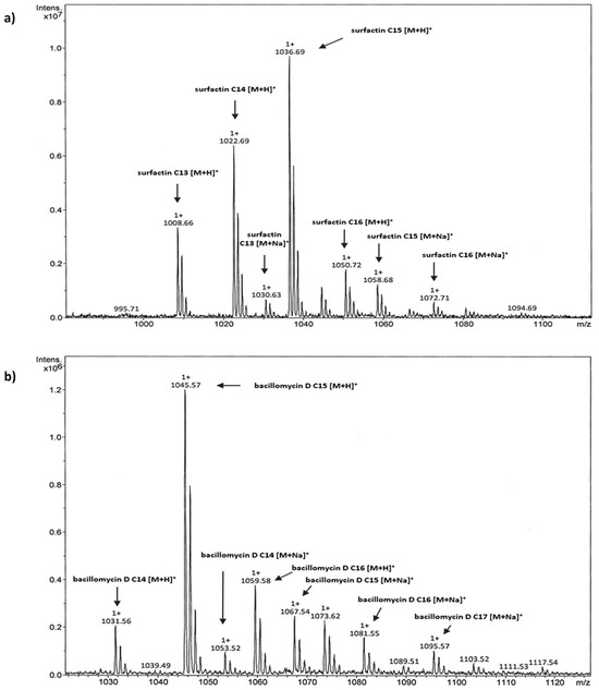 The HPLC-MS detected proton [M + H]+ and sodium [M + Na]+ adducts of surfactin and bacillomycin D) [15,16] in the ethyl acetate extract of B. amyloliquefaciens B-241 (Figure 5).