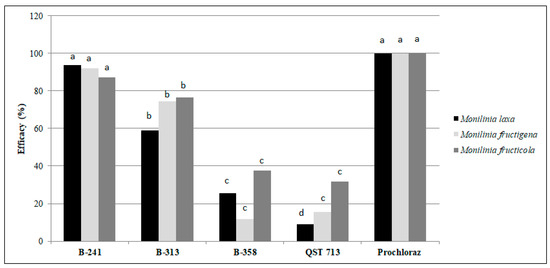 Effects of Bacillus spp. strains on Monilinia spp. in ex situ conditions. Data in the figure represent the mean of two trails conducted over time with four replicates per treatment. Columns, representing average efficacy, marked with the same letters are not significantly different (Duncan’s test, p > 0.05). Only columns marked with the same colour are comparable for significant differences.