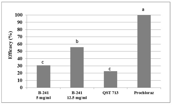 Effects of ethyl acetate extract of Bacillus amyloliquefaciens B-241 against Monilinia fructicola in ex situ conditions. Data in the figure represent the mean of two trails conducted over time with four replicates per treatment. Columns, representing average efficacy, marked with the same letters are not significantly different (Duncan’s test, p > 0.05).