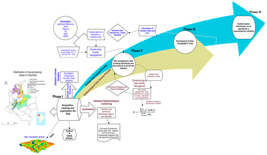 We implemented three phases. (i) Management, Cleaning, and Organization of Databases: our initial phase involved the meticulous management, cleaning, and organization of databases housing phytosanitary monitoring data and climatic variables within rice production systems in Colombia. (ii) Acquisition of Climatic Data via Web Scraping: in the second phase, we opted to procure a novel set of climatic data through the utilization of web-scraping tools. To achieve this, we accessed spatialized databases of climatological normals obtained from CHELSA and WORLDCLIM (WC). These datasets were subjected to a rigorous evaluation, validation, and adjustment process to rectify any identified biases. (iii) Development of Data Visualization Tools: in the final phase, our focus shifted towards the development of various tools dedicated to the visualization of epidemiological and climatic data. Emphasis was placed on an initial phase of analysis, where a method for ascertaining homologous and heterologous climatic zones was employed. Notably, this classification approach involved unsupervised methods using the spatial K-means algorithm.