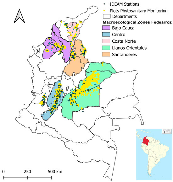 Macroecological and geographic distributions of rice-producing areas in Colombia and location of meteorological stations and plots sampled in the Fedearroz phytosanitary monitoring program.