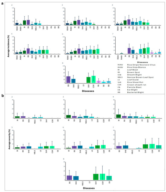The visualization based on the weighted means of the data from SP indicated that, during all phenological stages, the disease with the highest incidence was brown spot (BS), with values between 35% and 40%, followed by leaf blast (BI), which, from stages 2 to 6, presented incidences between 18% and 28%. During the stages considered as reproductive, specifically 5 to 8, the most relevant diseases in addition to BS were crown sheath rot (CSR), BS, rice sheath rot (ShR), and leaf scald (LS), with incidences between 18% and 40% (Figure 3a).