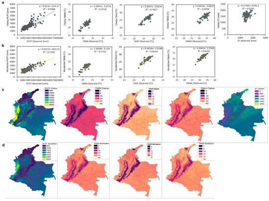 Performance of the annual cumulative values of the estimated datasets (a) CHELSA and (b) Worldclim with respect to the IDEAM in situ data for the variables PCPT, TMIN, TAVE, TMAX, and ET, and spatial distribution of the annual cumulative values of PCPT (mm), TMIN, TAVE, TMAX (°C), and ET (mm) climatologies of the (c) CHELSA and (d) Worldclim datasets.