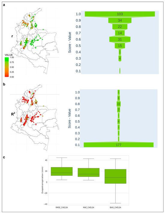 Spatial distribution and funnel plot with frequency of the (a) Pearson’s correlation (r) and (b) coefficient of determination (R2), and (c) boxplot with the calculated values of the error metrics RMSE, MAE, and BIAS, obtained from the comparison between the climatological normal of ET (mm) estimated dataset for CHELSA in relation to the data obtained from the IDEAM in situ station. When comparing the results for R2 in relation to the Pearson’s correlation coefficient r, it is observed that the R2 values vary depending on the station and area in the country. Figure S4 shows a visualization of the behavior of the multiannual monthly climatologies of precipitation according to R2 and r values.