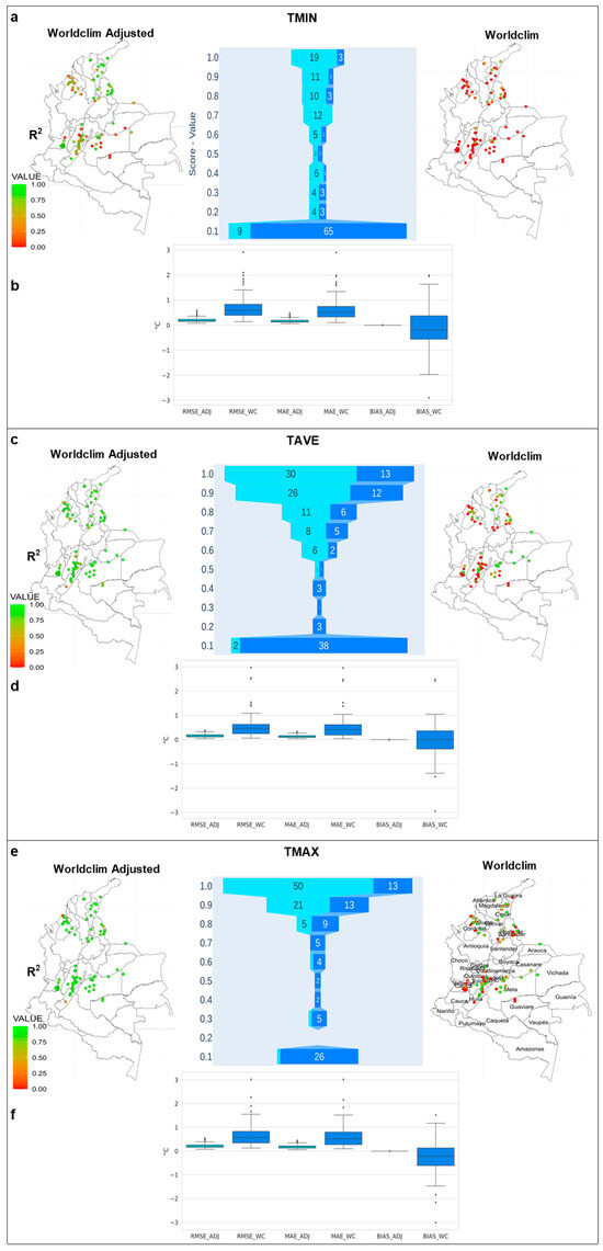 Spatial distribution and funnel plot with frequency of the coefficient of determination (R2) for each dataset of climatological normals estimated for (a) TMIN, (c) TAVE and (e) TMAX for initial WC (dark blue) and adjusted WC (light blue) values in relation to the observed data for the IDEAM. Additionally, boxplot with the calculated values of the error metrics RMSE, MAE, BIAS obtained from the comparison between initial WC (dark blue) and adjusted WC (light blue) for each variable (b) TMIN (°C), (d) TAVE y (f) TMAX (°C).