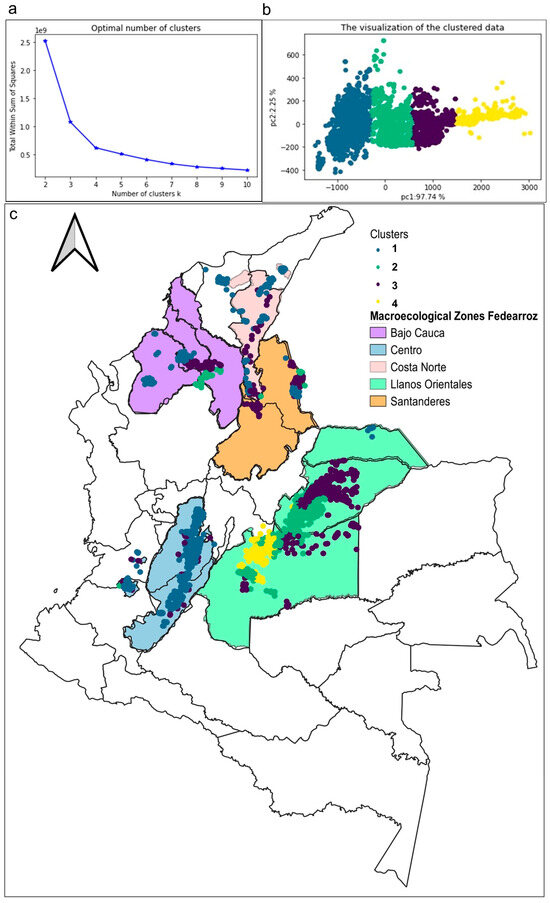 In our work, the clustering methodology used by [48] was taken as a reference, with some variations considered basic to improve the methodological adjustment. Multivariate statistics were used in a multistage process as follows. (i) Application of principal component analysis (PCA) to determine the important agroclimatic variables in the classification and grouping of producing areas (Table S3). In addition, PCA could be used to enable us to graphically elucidate the variation explained by the components and their interrelationship with the clusters employed in our analysis. PCA is a statistical procedure that seeks to reduce the dimensionality of a dataset by calculating new variables called principal components as linear combinations of the original variables [49]. (ii) To group the areas (homologues and heterologous zones based on climatic varication), a cluster analysis was performed, a process based on the differences of various types of objects and that uses distance regulation functions to produce unsupervised classification models [50]. For this, the K-means grouping method was implemented in the sklearn library run in the Colab Python environment [51]. This method consists of an algorithm that separates a set of data into k groups based on the distance between the data and the central regions of the groups [52]. This produces a separation of the objects into groups from which the metric to be minimized can be calculated [52]. K-means is a widely recognized and employed method for its suitability for climate clustering [46,47]. The use is supported by the following key justifications: simplicity and speed, interpretability, scalability, proven effectiveness, flexibility in number of clusters (K), robustness, and availability in tools and libraries [52,53]. In addition, for this process, the cluster number to be determined is a critical factor for obtaining good results. Therefore, to establish the grouping criterion, the elbow method was applied, which consisted of examining the percentage of variance explained based on the number of clusters [54]. The “elbow method” is a widely used technique in data analysis and clustering to determine the optimal number of clusters (K). The process involves executing the K-means algorithm with a range of K values, typically from 1 to a predetermined upper limit [54]. For each K value, the algorithm computes the sum of squared distances (often referred to as the within-cluster sum of squares between data points and their assigned cluster centroids) [54]. Subsequently, once the clusters were generated, the clusters were spatially projected onto the rice-producing areas. This process was validated by the Fedearroz technical team, confirming that the analytical process agreed with the empirical groupings, but with a higher spatial resolution and with the general climatic classification of the rice-producing areas in Colombia. (iii) Finally, for each cluster, the attributes of the agroclimatic variables that were important for the climatic characterization that determined each cluster were described.