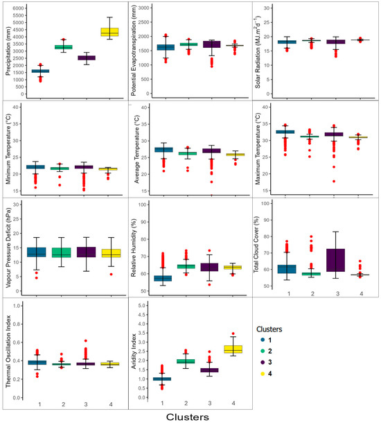 Boxplot with the characteristics of the climatic variables that determine each cluster or homologous climatic zone obtained from the K-means clustering analysis. Cluster 1 (boxes in blue), cluster 2 (boxes in green), cluster 3 (boxes in purple), and cluster 3 (boxes in yellow).