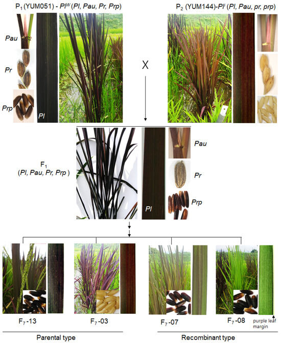 In this study, we analyzed rice genotypes exhibiting color development in various organs. Plw and Pli are the two alleles of Pl-type purple-leaved rice that we studied intensively in the two parent lines. YUM051 had uniformly dark purple coloration in the leaf blade (Plw) with a deep purple auricle (Pau), internode, purple pericarp (Prp), and purple hull (Pr). In contrast, YUM144 showed a less intense purple coloration in the leaf blade (Pli) and stems, with a white pericarp (prp) and hull (pr) (Figure 1 and Table 1). Both the Plw and Pli parents were reciprocally hybridized to analyze color segregation in specific tissues. The coloration was segregated with various patterns in the different organs of the subsequent progenies. Because of the many patterns of color distribution, it was difficult to characterize the progenies in the F2 generation. Therefore, individual progenies showing a unique phenotype from self-pollinated populations were selected. Consequently, we analyzed seven generations of offspring with fixed alleles for the Pl and Prp traits of interest (Figure 1).