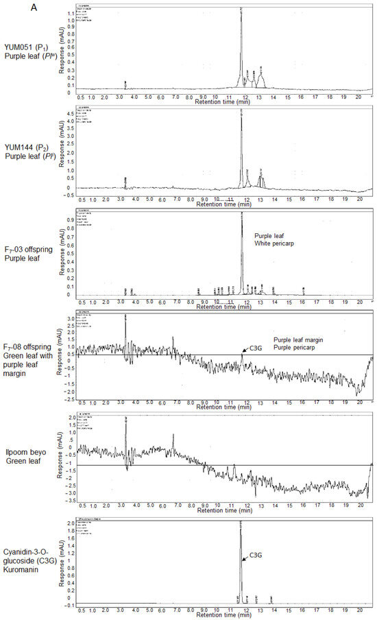 We analyzed the anthocyanin content in the leaf and seed pericarp. Leaf extracts from the green leaf control plant (Ilpoom), the dark purple (Plw), and diluted purple (Pli) parents, along with their two F7 progenies exhibiting purple and green leaf with purple leaf margins, were subjected to HPLC analysis. A prominent peak for C3G was observed in the Plw, Pli, and F7-03 offspring with dark purple leaves. In contrast, a small amount of kuromanin was detected in the F7-08 offspring, with green and purple leaf margins (Figure 2A). The presence of this negligible amount of C3G in F7-08 may have contributed to the pigmentation at the leaf margin (Figure 1). Control plants with green leaves showed no pigment signals (Figure 2A).