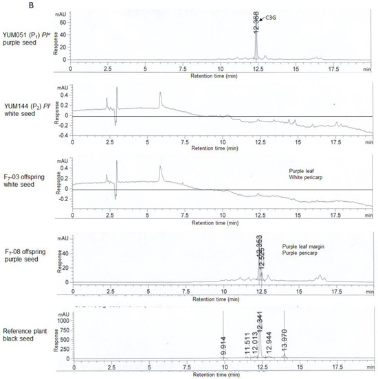 In another experiment, the anthocyanin content of the seed extracts from the parents and their progenies was measured. The Plw parent and F7-08 offspring with purple seed pericarps and one reference plant with black seed pericarps had significant amounts of C3G, as they produced relative signals, whereas the Pli parent and F7-03 offspring with white pericarps exhibited no C3G in their extracts, as no detectable peak was observed (Figure 2B).