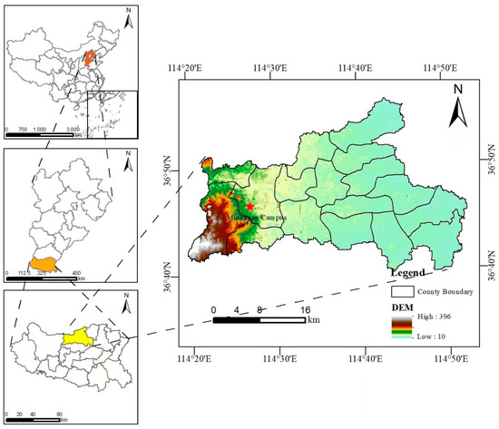 The experiment was conducted at the Mingguan Campus, Yongnian District, Handan City, Hebei Province (located at the longitude of 114°20′ E–114°52′ E and latitude of 36°35′ N–36°56′ N). The test site was located in the south of Hebei Province and north of Handan City (Figure 1). The terrain of the whole area is high in the west and low in the east. From west to east, it can be divided into regions with low mountains and hills, piedmont sloping plains, plains, depressions, and other geomorphological units, belonging to a warm, temperate, semi-humid, continental, monsoon climate. Between 2007 and 2017, the average annual precipitation in the study area was 503.6 mm; July–August was the main flood season, during which the rainfall was 285.1 mm, accounting for 58% of the annual rainfall. Winter (December–January) precipitation was 14.1 mm, accounting for only 3% of the annual precipitation. From 2007 to 2017, the average annual evaporation was 1997.5 mm, with the peak being in June (average of 354.4 mm) and the trough in December–January (averaging 53.6 mm) (Figure 2).