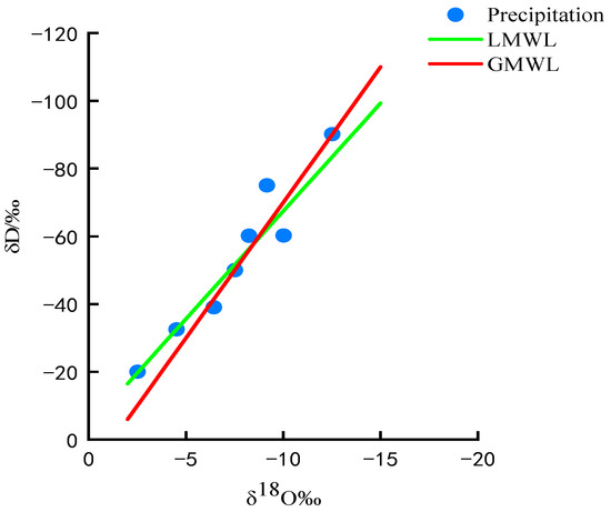 The δD and δ18O ranged from −90.17‰ to −20.02‰, and −12.52‰ to −2.51‰, respectively, with averages of −53.40‰ ± 21.45‰ and −7.61‰ ± 2.95‰. Regression analysis of the hydrogen and oxygen isotopes of rainfall was carried out to obtain the local atmospheric drawdown line. The local meteoric water line (LMWL): δD = 6.37δ18O − 3.77 (R2 = 0.832). Compared with the global meteoric water line (GMWL), the slope and intercept of the LMWL formula in this study area were both smaller, indicating that the evaporation fractionation phenomenon of the raindrops in this region was more intense when they broke away from the clouds and fell to the surface.