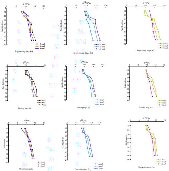 Figure 6 indicates that the straw returning amount has an effect on soil water δ18O at different growth stages and with the same irrigation amount (because δD and δ18O are in good agreement with soil water isotopes). At different growth stages of wheat, δ18O values decreased with the increase in soil depth. The effects of straw returning and irrigation amounts on δ18O were different at the developmental phases of winter wheat. The maximum δ18O value of soil water in each growth stage was distributed at 10 cm. Under the same irrigation amounts, from 0 to 20 cm of straw returning, there was a gradual rise in δ18O values, whereas from 20 to 80 cm of straw returning, there was a gradual decline. Under the same straw returning amounts, δ18O increased with the increase in irrigation(Table 2).