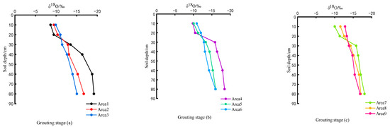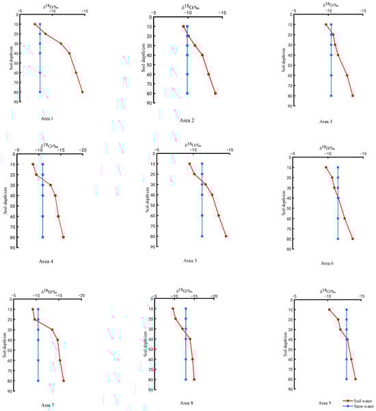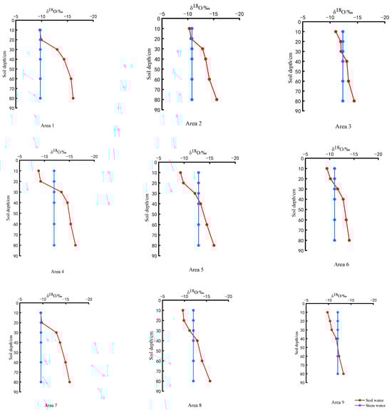 (3) At different growth periods and with the same irrigation amount, the straw returning amount had an effect on soil water δ18O (because δD and δ18O were in good agreement with soil water isotopes). The δ18O value of soil water exhibited a gradual decrease with increasing soil depth during various growth stages of wheat. The maximum δ18O value of the soil water at each growth stage was distributed at 10 cm. Under identical irrigation conditions, an incremental rise in the δ18O value was observed, as the straw returning amount increased from 0 to 20 cm and decreased gradually with the increase in the straw returning amount from 20 to 80 cm.