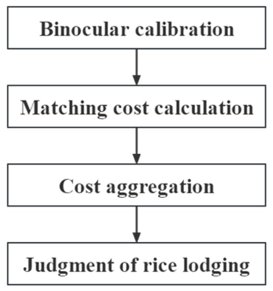 The rice lodging judgment algorithm proposed in this article consists of four steps: camera and IMU calibration, matching cost calculation, cost aggregation, disparity calculation, and lodging judgment. A flow chart of the proposed rice lodging judgment is shown in Figure 1.