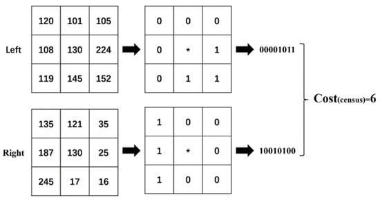 Consider a 3 × 3 window as an example (shown in Figure 3). Census feature calculation results for the left and right windows are shown in Figure 3. 00001011 for the left window and 10010100 for the right window represent Census features in bit-string format. The bit-string Hamming distance of the left and right windows is calculated as the Census feature matching cost value under the center pixel. The Hamming distance calculation for this left and right window is 6.