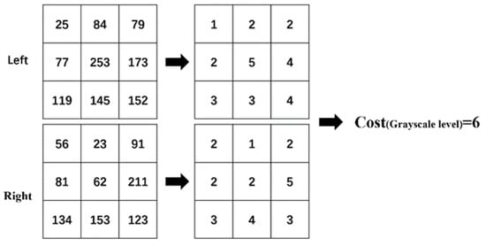 Consider the Grayscale Level cost calculation for a 3 × 3 window. In Figure 5, the left and right windows of 3 × 3 size are filled with random grayscale values. The Grayscale Level values for the pixel points in the left and right windows are calculated based on Equation (4). The Grayscale Level values at the same pixel points in the left and right windows are compared using Equation (5). The number of unequal Grayscale Level values is used as a cost value for the center pixel of the window. The Grayscale Level feature cost value was calculated for the left and right windows as 6.