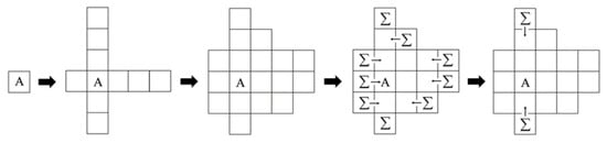 Figure 6 illustrates the steps involved in cost aggregation in this article. In the first step, the practical length information is calculated for the four horizontal and vertical directions at pixel center A and saved. Once the length information for the four directions has been determined, the second step calculates the horizontal direction lengths of all pixels based on the vertical direction lengths. This calculation is completed and saved to get the adaptive cost aggregation region for pixel center A. The third step involves adding all pixels in the vertical direction of pixel A, along with their corresponding horizontal arms. The horizontal cost aggregation is completed. The fourth step consists of summating the costs of pixel center A after aggregation in the horizontal direction along the vertical path. The final aggregated cost of this pixel A is obtained after the operation is completed.