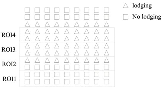 An image of a rice field collected for lodging judgment is easily interfered with by noise, such as rice movement or shadows. To minimize noise interference, the rice region to be detected was divided into equally spaced regions of interest (ROI). Calculate the average distance between all targets in the ROI and the camera level. A distance threshold TH is given. Define the ROI as an un-lodging region when , and define the ROI as a lodging region when . Figure 7 illustrates the judgment schematic for one of the rice field images collected. The middle and lower parts of the image were divided into ROIs with equal spacing. The distance between the rice in each ROI and the camera level can be determined. Given the distance threshold TH, the lodging regions are ROI 4, and ROI 3 can be obtained by threshold judgment.