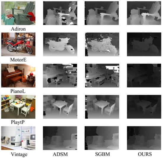Regarding index parameters, ADSM has similar results to the algorithm presented in this article. However, the index parameters of some ADSM images are substantially lower than our algorithm. Table 1 indicates that the algorithms of this article are more robust on different images. Figure 8 illustrates the disparity map generation results of the three algorithms. Overall, the disparity map results are more satisfactory. It is worth noting that on the MotorE and PianoL images, both SGBM and ADSM exhibit a significant degree of disparity mismatch. In addition, they show large void regions. This article’s algorithm can better match weak and repeated texture regions. The disparity map indicates that Grayscale Level cost can improve image matching effectiveness.