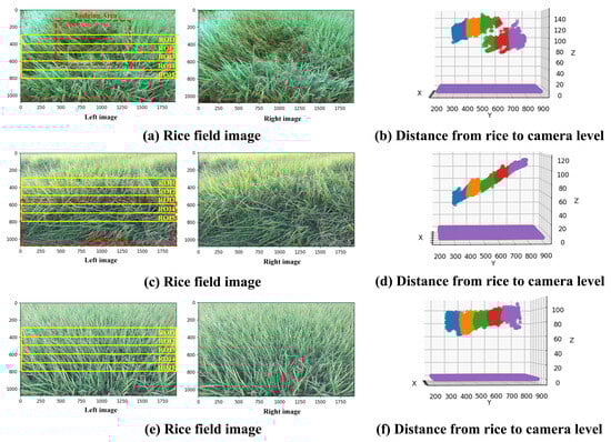 The algorithm presented in this article was used for the rice lodging judgment test. A tripod is used to fix the binocular camera in the rice field. Binocular cameras are connected via USB to a laptop computer that serves as the host computer. Figure 9 illustrates the field. The right and left images were 1920 × 1080 (width × height). A red box indicates the lodging rice region in Figure 10a. There were five equal-spaced regions to be detected. The five regions were kept the same width. The height ranges of the five regions are [300, 400], [400, 500], [500, 600], [600, 700], and [700, 800], respectively. Calculate the 3D world coordinates of all pixels in the five regions in the current camera pose. By transforming the rotation matrix coordinates of the IMU, the 3D world coordinates of the camera in horizontal posture can be obtained. In Figure 10b,d,f, the X-axis represents the width of the image, the Y-axis represents the height of the image, and the Z-axis indicates the distance between each pixel target in the five regions and the horizontal plane of the camera (which corresponds to the distance y in the schematic of Figure 2).