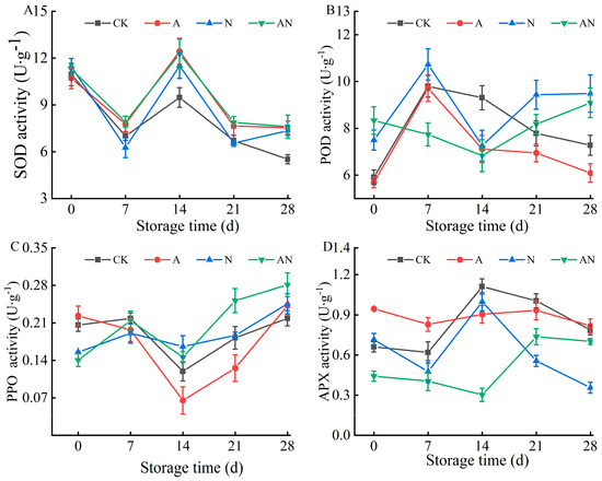3.5. Effects of Pre-Harvest SA and SNP Spraying on Enzyme Activity of Manaohong Cherries during Storage