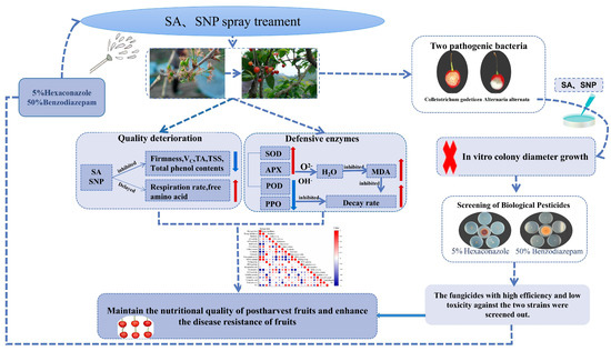- Cao, J.; Yan, J.; Zhao, Y.; Jiang, W. Effects of postharvest salicylic acid dipping on Alternaria rot and disease resistance of jujube fruit during storage. J. Sci. Food Agric. 2013, 93, 3252–3258. [Google Scholar] [CrossRef]