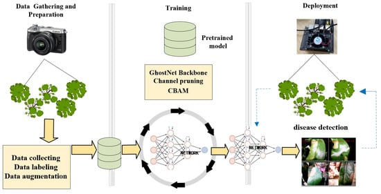 This paper proposes a method for detecting lychee leaf diseases that consists of three main steps: data collection and augmentation, model pruning and optimization, and deployment, as illustrated in Figure 1.