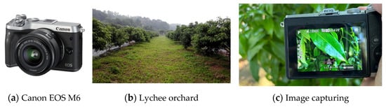 The lychee disease data were collected from the tree orchard of the College of Horticulture, South China Agricultural University, Guangzhou, China. The data collection took place from 2 March to 28 May 2023 during the time intervals of 8:30 AM to 11:30 AM and 2:30 PM to 5:30 PM. The data were captured using a high-resolution camera, and the distance between the image capturing device and the diseased leaves ranged from 0.25 m to 0.55 m. The camera used in the experiment and the test site are shown in Figure 2a,b. Figure 2c shows our method of capturing lychee disease images.