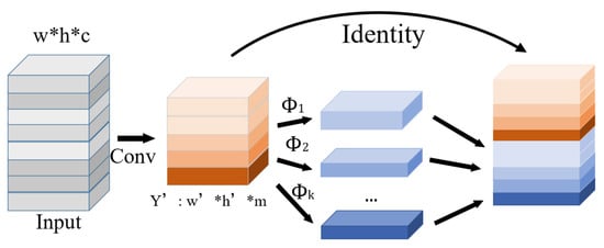 As shown in Figure 5, Φi represents a linear transformation. Assuming that there are n output feature maps, the Ghost module will obtain m feature maps through identity mapping, as well as m × (s−1) linear operations (where s represents the number of feature maps after linear operations). Here, n = m × s. We define the kernel size for each linear operation and the traditional convolution as k × k. When s is much smaller than c, it can be deduced that the acceleration ratio (r_s) and parameter compression ratio (r_c) for the Ghost module, compared to standard convolution, can be calculated as follows: