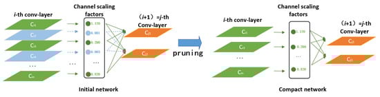 As shown in Equations (3) and (4), and represent the input and output of the BN layer, respectively. and represent the mean and standard deviation of each batch. The parameter is a small positive number used to avoid division by zero. Additionally, the BN layer introduces scaling factorsand biases for each channel, which normalize the channel data [28]. During the training process, when the scaling factor is small, the corresponding activation will also be small. Output with approaching zero contributes minimally to the model, allowing the pruning of the channel output in the BN layer. Furthermore, when the scaling factor is relatively uniform, making it challenging to prune, as shown in Equation (5), we introduce the L1 regularization constraint of in the loss function to induce sparsity. The regularization term is added to the function, where is the regularization coefficient.