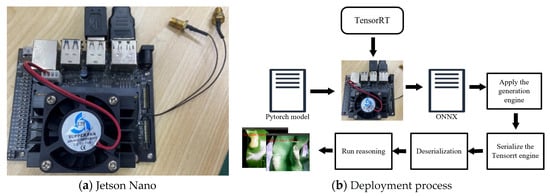 The specific deployment process involves using a pre-trained PyTorch model and transferring it to the Jetson Nano. Subsequently, it undergoes conversion into the ONNX model format, followed by importation into TensorRT for the generation of an accelerated network inference engine. The resulting engine file can be permanently stored through serialization, enabling its subsequent loading through deserialization to facilitate inference. The overall structure is illustrated in Figure 7b.