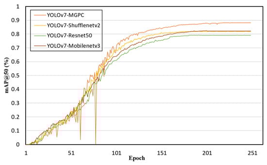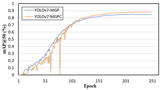 Figure 8 compares the performance of YOLOv7-MGPC with that of YOLOv7-MGP. It is observed that YOLOv7-MGPC learns a little slower due to the process of the adaptation of the attention mechanism to the specific pattern of the lychee data and extraction of informative features. After training convergence, the CBAM attention mechanism results in a 2% increase in mAP with negligible computational costs.