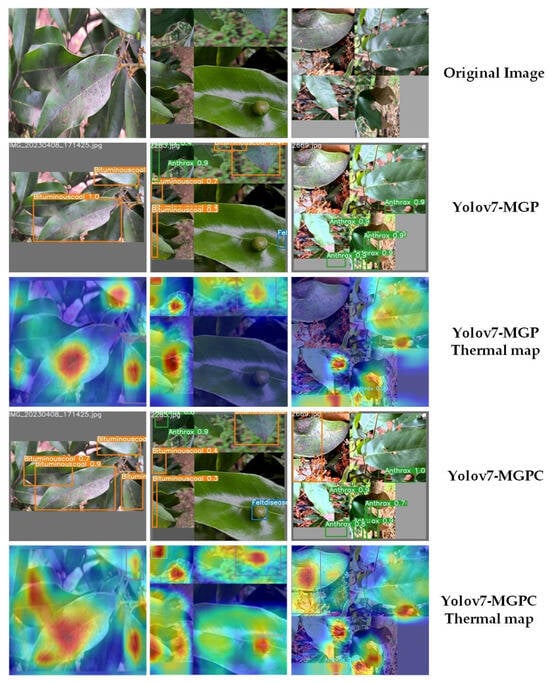 To further demonstrate the effectiveness of the improved YOLOv7-MGPC model, Class Activation Maps (CAM) [29] were used for the visual analysis of disease detection. The heatmaps in Figure 9 depict the model’s weight and focus transfer during training, demonstrating which part of the features contribute to the classification decision. It is evident that before the introduction of the attention mechanism, the network did not give sufficient attention to less prominent disease features. However, after incorporating the attention mechanism, the network becomes capable of detecting finer disease features and accurately identifying the affected areas.