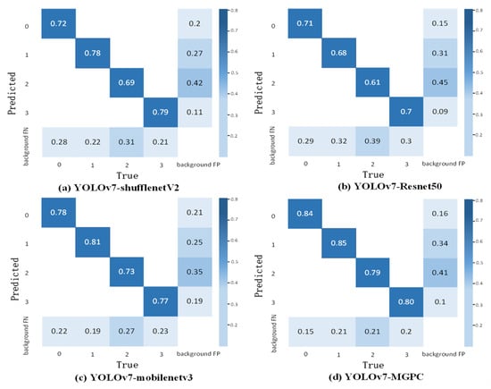 In order to further validate the effectiveness of the proposed model, comparative experiments were conducted by replacing the original YOLOv7 backbone network with current main-stream lightweight feature extraction models, including MobileNetV3, ShuffleNetV2, and ResNet50. As shown in Figure 10 and Table 4, it is evident that the improved YOLOv7-MGPC outperforms other lightweight networks in terms of accuracy. It achieves a higher accuracy, ranging from 4.9% to 9.4%, compared to the other models. Regarding detection speed, when compared to YOLOv7-ShuffleNetV2, YOLOv7-MGPC is only 16 frames/s slower, but its accuracy is 5.5% higher. Compared to YOLOv7-MobileNetV3 and YOLOv7-ResNet50, YOLOv7-MGPC has a speed advantage of 10 frames/s to 35 frames/s while maintaining comparable parameter sizes. Figure 11 shows the confusion matrix for the recognition results of different disease classes obtained via various network models.