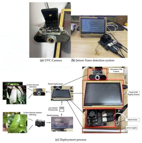 As illustrated in Figure 12, the system configuration included a GUCEEHD98 camera and a Nvidia Jetson Nano edge computing device, with the Jetson Nano running the Linux operating system and utilizing TensorRT acceleration capabilities. This deployment allowed for practical, on-site testing and demonstrated the practicality of the YOLOv7-MGPC model in real-world agricultural scenarios thanks to its lightweight design and optimized inference process using TensorRT on the Nvidia Jetson Nano.