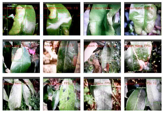As illustrated in Figure 13, it is evident that our easily constructed Jetson Nano detection platform excels in real-time scene detection, accurately identifying lychee diseases at a remarkable speed range of 8–13 frames/s. The real-time detection demonstrated in the field underscores the model’s efficiency, precise target recognition, and ability to meet the accuracy and efficiency demands of practical applications. This achievement holds promising implications for the advancement of agricultural intelligence and automation projects, providing both the technical prowess and theoretical foundation necessary for their success.