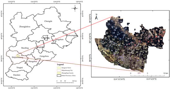 The selected study area (Figure 1) is Zhengding County and Zengcun Town, Gaocheng District, Shijiazhuang City, Hebei Province, China, located at approximately 37°51′~38°18′ N, 114°39′~114°59′ E. The study area has a temperate semi-humid to semi-arid continental monsoon climate, with distinct seasons in most regions. The annual average temperature is 12.9 °C, and the annual average precipitation is 550 mm. Cultivated land is the predominant land use type in this region, with winter wheat being one of the major food crops.