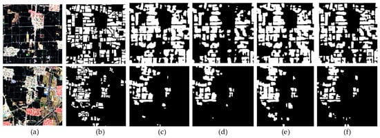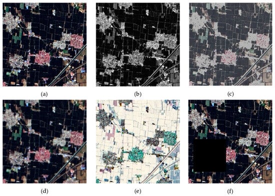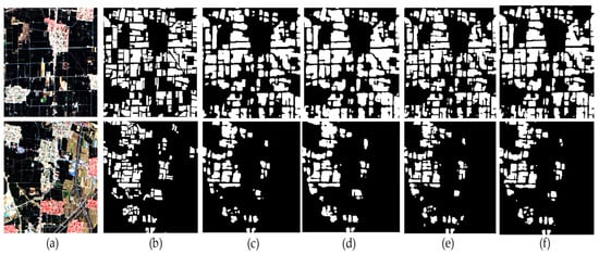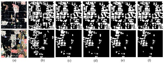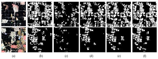 Comparison of extraction effects for the semi-supervised SegNet under different ratios of labeled data: (a) Original image; (b) labeled data; (c) 1/16; (d) 1/8; (e) 1/4; and (f) 1/2.