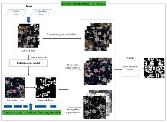 Generative adversarial networks (GANs) are generally utilized for tasks related to generative modeling, where they generate data that are similar to the training data. They indirectly might benefit semi-supervised learning but not as a direct supervision signal, are not easy to optimize, and may encounter mode collapse issues []. Pseudo-labeling [] is a combination of entropy minimization and consistency regularization, which relies on the assumption that pseudo-labels generated by a teacher model can benefit the training of a new model. FixMatch [] achieves consistency training by applying strong data augmentation (Cutout, CTAugment, and RandAugment) to the unlabeled loss and input for pseudo-label generation, encouraging the outputs of two augmented inputs to remain consistent. As an extension of FixMatch, PseudoSeg [] uses weak and strong augmentations on an unlabeled image and uses the predictions of the weakly augmented image as pseudo-labels for the strongly augmented image. This method generates pseudo-labels using only the image itself.