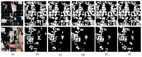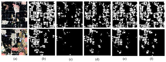Comparison of extraction effects for the semi-supervised DeepLabv3+ under different ratios of labeled data: (a) Original image; (b) labeled data; (c) 1/16; (d) 1/8; (e) 1/4; and (f) 1/2.