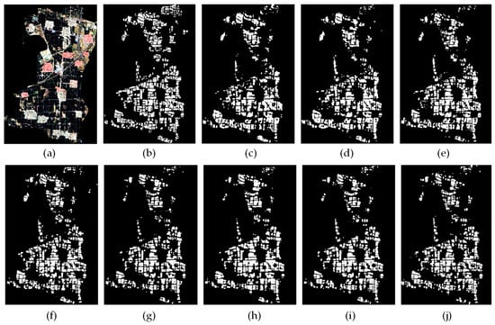 Comparison of extraction effects for the semi-supervised U-Net under different ratios of labeled data: (a) Original image; (b) labeled data; (c) 1/16 fully supervised; (d) 1/8 fully supervised; (e) 1/4 fully supervised; (f) 1/2 fully supervised; (g) 1/16 semi-supervised; (h) 1/8 semi-supervised; (i) 1/4 semi-supervised; and (j) 1/2 semi-supervised.