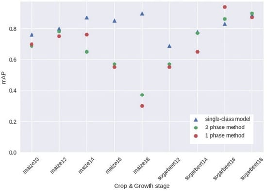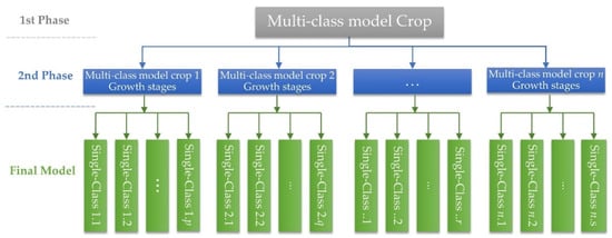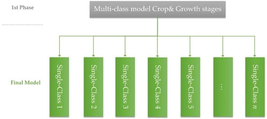 Single-phase approach: in this method, a multiclass model is trained with all the different crops and growth stages, which may be more susceptible to loss of accuracy depending on the number of images (Figure 2).
