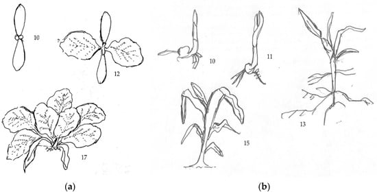 Graphical examples of phenological growth stages and their respective BBCH identification codes. (a) Sketch of sugar beet plants in growth stage 10, with the first leaves visible, stage 12 with 2 leaves unfolded, and stage 17 with 7 leaves; (b) sketch of maize plants in stage 10 of growth with the first leaf through the coleoptile, stage 11 with one leaf unfolded, and stages 13 and 15 with 3 and 5 leaves unfolded, respectively.