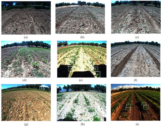 Examples of images of the datasets: (a) Maize growth stage 10; (b) maize growth stage 12; (c) maize growth stage 14; (d) maize growth stage 16; (e) maize growth stage 18; (f) sugar beet growth stage 12; (g) sugar beet growth stage 14; (h) sugar beet growth stage 16; (i) sugar beet growth stage 18.