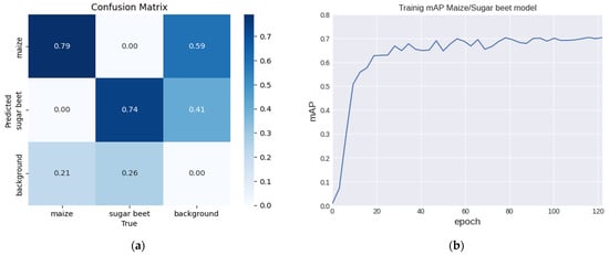 (a) The crop identification model’s confusion matrix compares predicted results with actual results for each class, specifically maize and sugar beet crops. (b) The mAP values and epochs graph depicts the training process for the crop models.